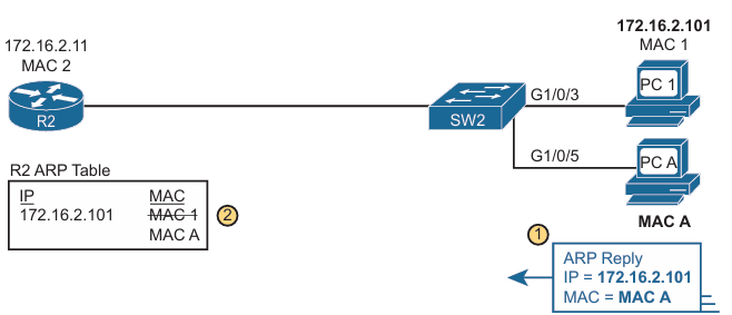 Dari contoh di atas, yang seharusnya IP 172.16.2.101 memiliki MAC address MAC1 namun, attacker (PC A) mengirimkan ARP gratuitous ke R2 dengan memberikan informasi bahwa IP 172.16.2.101 memiliki MAC address MAC A. Sehingga PC A akan menjadi man in the middle.