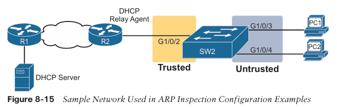 Contoh konfigurasi untuk penggunaan Dynamic ARP Inspection, seperti di bawah: