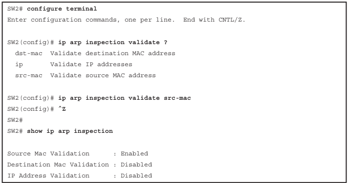 DAI juga bisa perform optional check, seperti mengecek Ethernet header source MAC address harus sama dengn ARP MAC address, seperti di bawah.