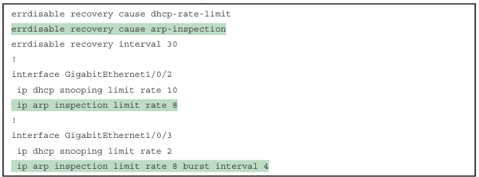 DAI rate limit dapat dikonfigurasi dengan burst time, berbeda dengan DHCP Snooping yang tidak dapat dikonfigurasi timenya. Berikut contoh konfigurasi limit DAI message rate dengan errdisable recovery.