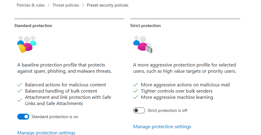 Silakan disesuikan untuk rules dan policies sesuai dengan design masing-masing. Jika tidak ada request costum dari customer, maka dapat menggunakan salah satu preset security policies yang telah disediakan oleh Microsoft, yaitu:
